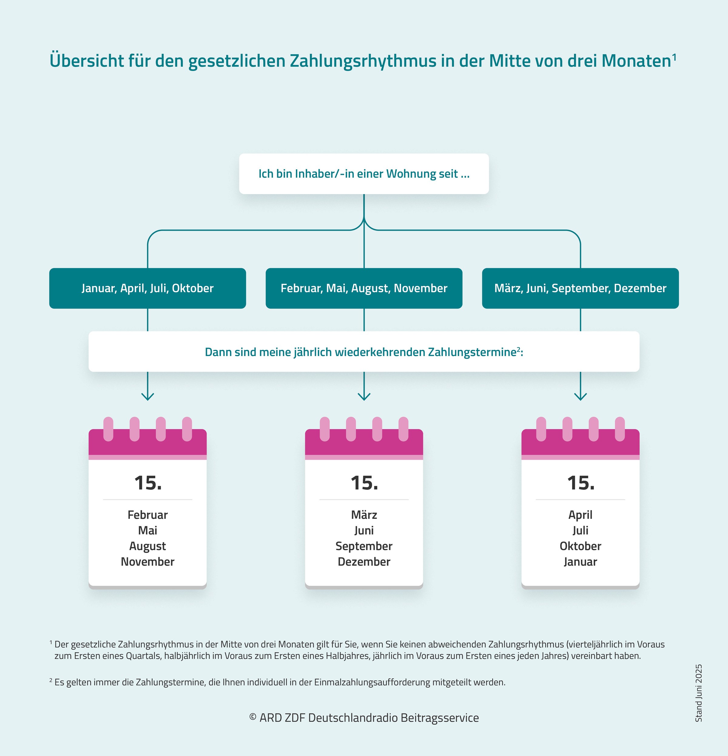 Der gesetzliche Zahlungsrhythmus bleibt vierteljährlich: Der Beitrag von derzeit 18,36 Euro pro Monat wird in der Regel für drei Monate gebündelt fällig, also 55,08 Euro je Quartal, jeweils zur Mitte des Dreimonatszeitraums. Wer etwa im Januar erstmalig beitragspflichtig wird, muss zum 15. Februar für Januar bis März zahlen; weitere Termine folgen im Mai, August und November – und genau diese Abfolge steht in der Einmalzahlungsaufforderung.